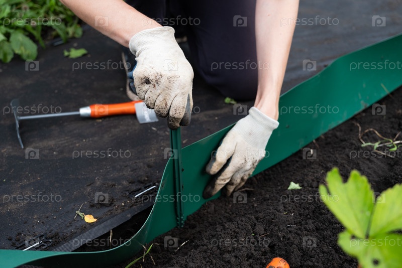 Садовник устанавливает пластиковый край травы вокруг дерева в саду