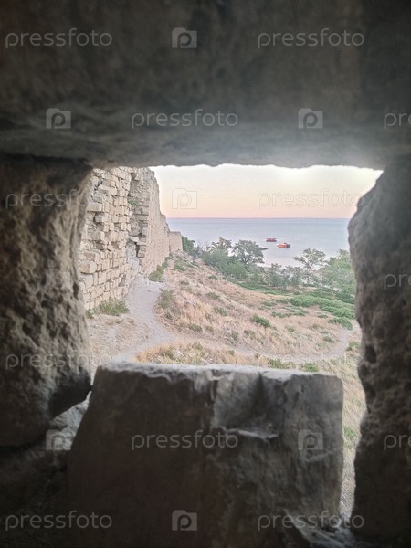 Средневековая каменная стена с видом на море, фон древней крепости, исторические окно обои