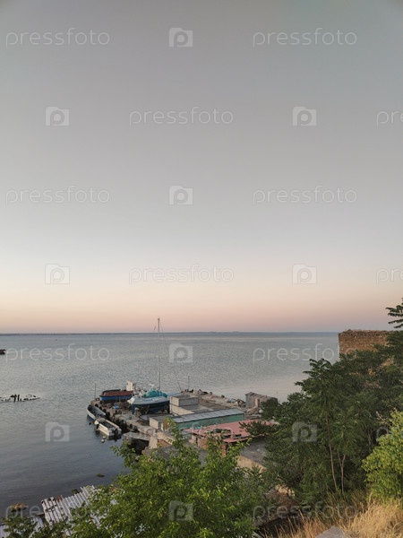 Спокойное море и пастельное солнцезападное небо, мирный фон набережной, спокойные вечерние обои