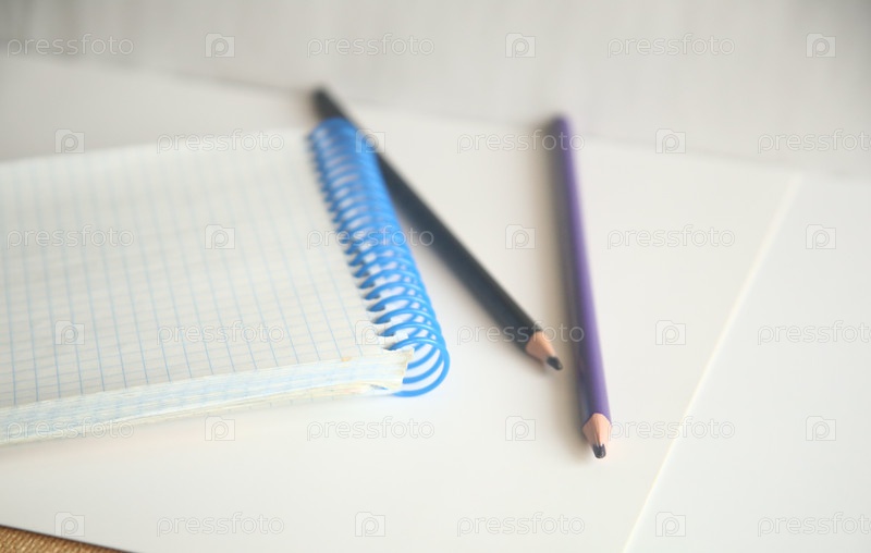 Школьные канцелярские товары карандаши и блокнот на белом фоне