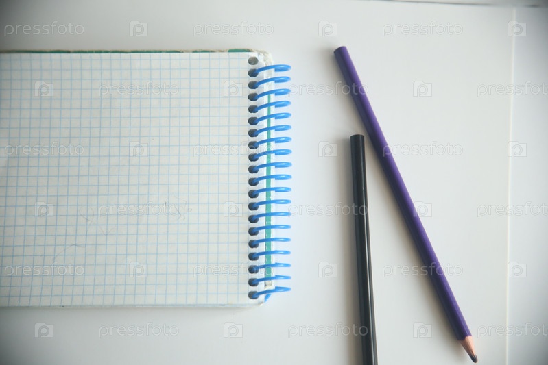 Школьные канцелярские товары карандаши и блокнот на белом фоне