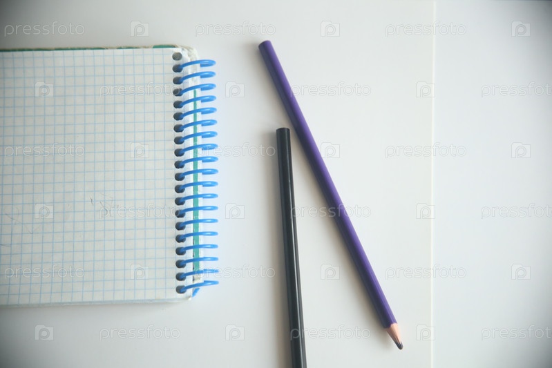Школьные канцелярские товары карандаши и блокнот на белом фоне