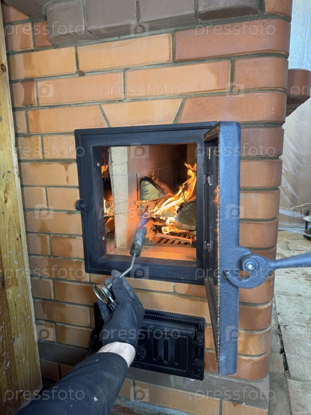Изготовитель плиты зажигает испытательный огонь в коробке для печи. Древесина и пламя видны. Строительство нагревательной плиты. Свежая кирпичная кладка