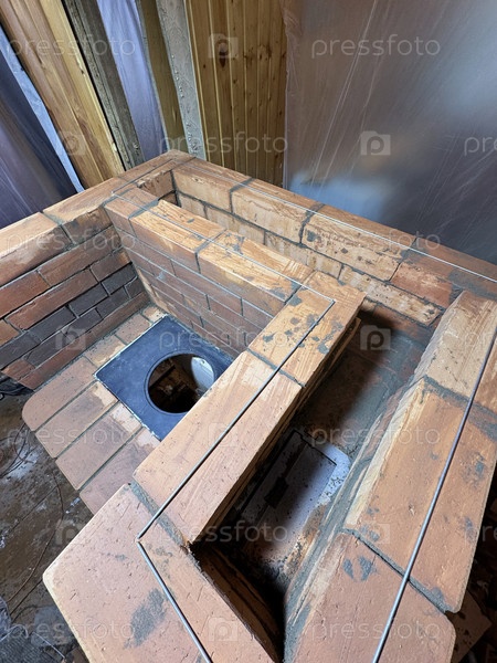 Строительство отопительной плиты. Кухонный стол на близком расстоянии. Дымные каналы. Кирпичная кладка, усиленная проволокой