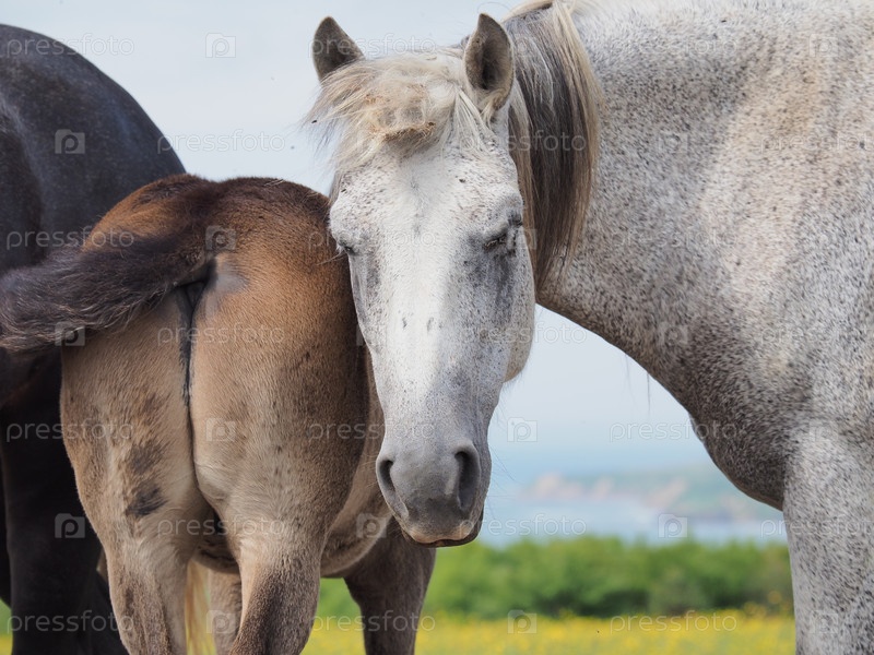Лошади на пастбище. Кони в пастбище. Сахалин. Сахалин. (marka)