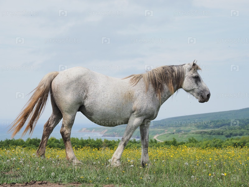 Лошади на пастбище. Кони в пастбище. Сахалин. Сахалин. (marka)