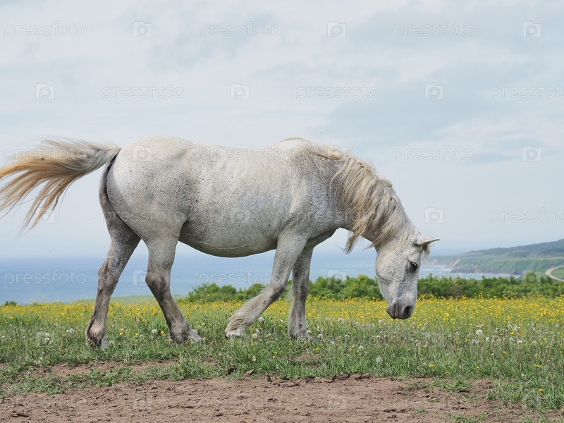 Лошади на пастбище. Кони в пастбище. Сахалин. Сахалин. (marka)
