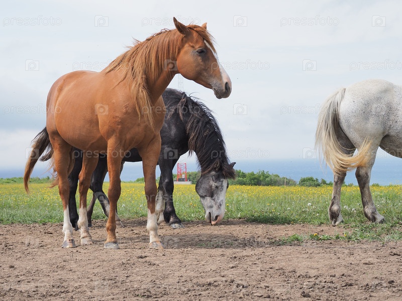 Лошади на пастбище. Кони в пастбище. Сахалин. Сахалин. (marka)