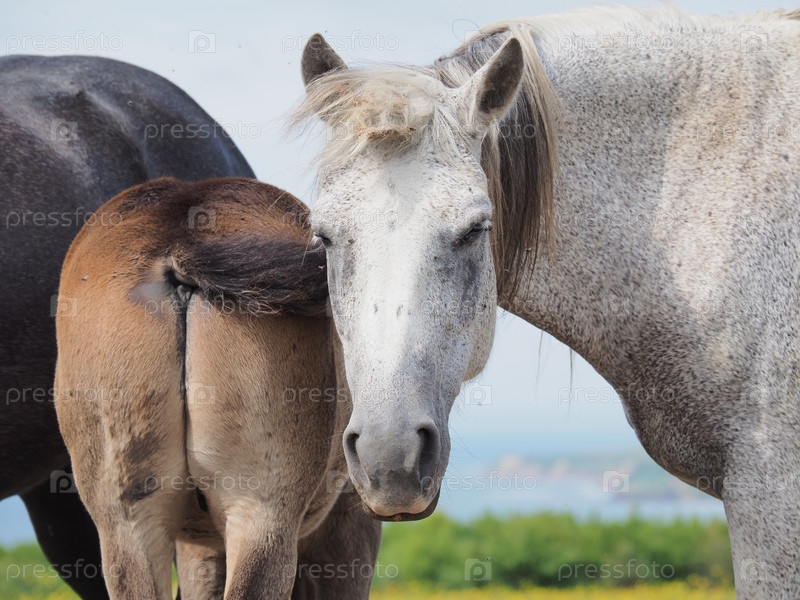 Лошади на пастбище. Кони в пастбище. Сахалин. Сахалин. (marka)
