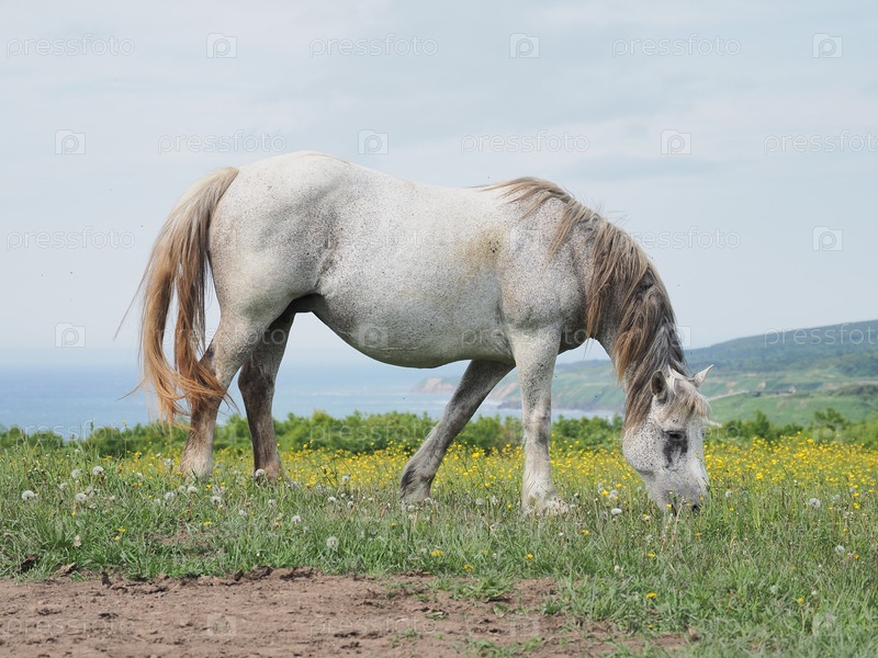 Лошади на пастбище. Кони в пастбище. Сахалин. Сахалин. (marka)
