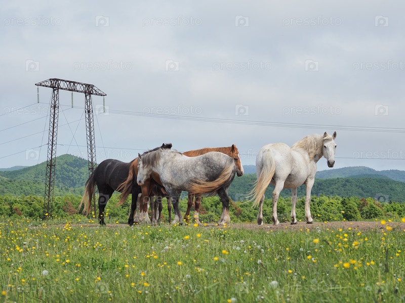 Лошади на пастбище. Кони в пастбище. Сахалин. Сахалин. (marka)