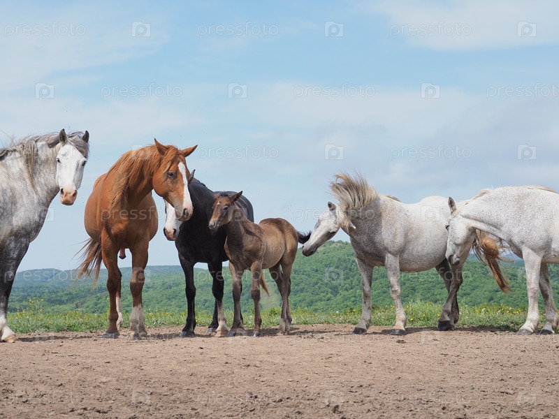 Лошади на пастбище. Кони в пастбище. Сахалин. Сахалин. (marka)