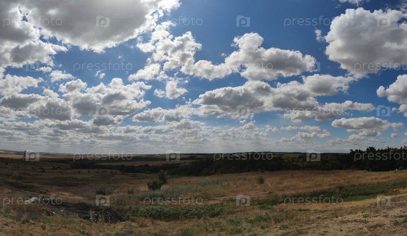 Под ярким небом с белыми циррусовыми облаками виден сельский пейзаж с широкими полями, холмами и лесными плантациями. степи Кавказского нагорья