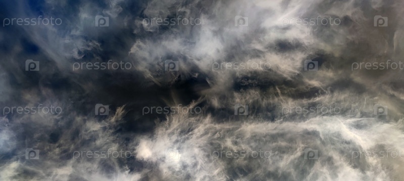Высокие цирровые облака. Яркое летнее небо. Высокие, полупрозрачные цирровые облака разбросаны по небу. Облака серого и белого цвета. Они заполняют почти все пространство, а голубое небо видно сквозь них