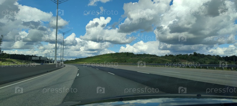 Голубое небо над дорогой. Широкая полоса между полями, через которые проходит шоссе. По краям дороги растет трава и видны широкие поля. Облака плавают по небу