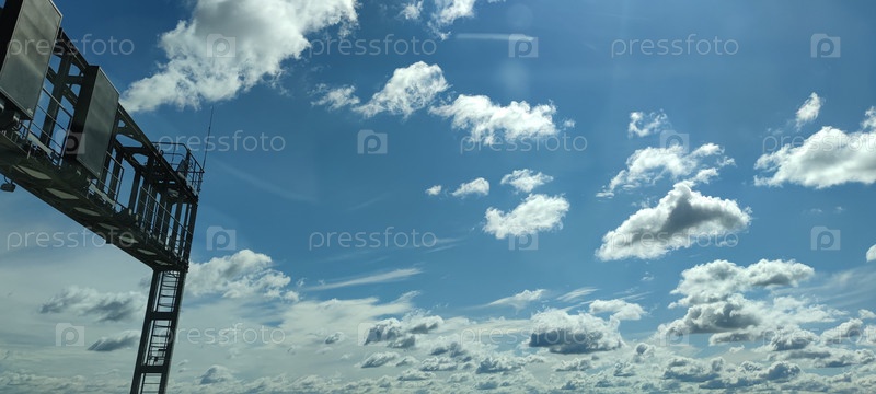 Облака на разных уровнях. Яркое летное небо. Высокие, полупрозрачные циррусные облака и низкие кумуловые облака распространяются по небу. Облака серого и белого цвета различных форм и размеров