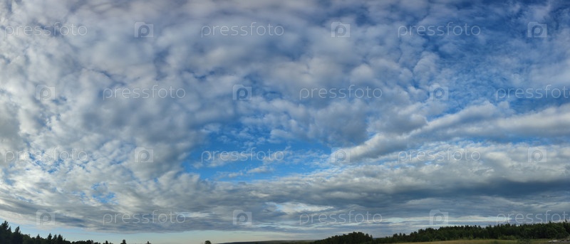 Облака на разных уровнях. Яркое летное небо. Высокие, полупрозрачные циррусные облака и низкие кумуловые облака распространяются по небу. Облака серого и белого цвета различных форм и размеров