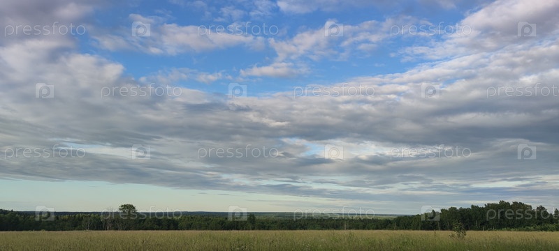Зеленое поле под облаками.В солнечный летний день в голубом небе висят небольшие кумулярные облака.Под ними зеленая луга с высокой травой и дикими цветами.На расстоянии видится лес
