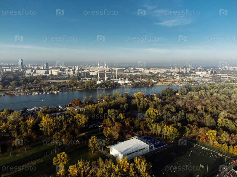 Вид с беспилотника над открытым общественным парком и зелеными деревьями. 4K