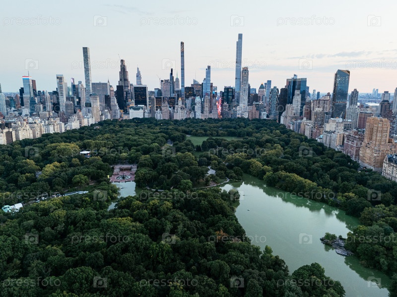 Вид из воздуха Центрального парка с горизонтом Манхэттена на закате, Нью-Йорк, США. g