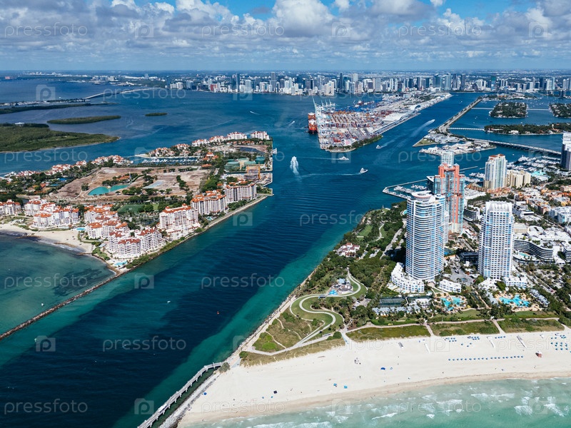 Вид с воздуха Южного Пойнт-Бич, острова Фишера и горизонта города Майами под голубым небом. c