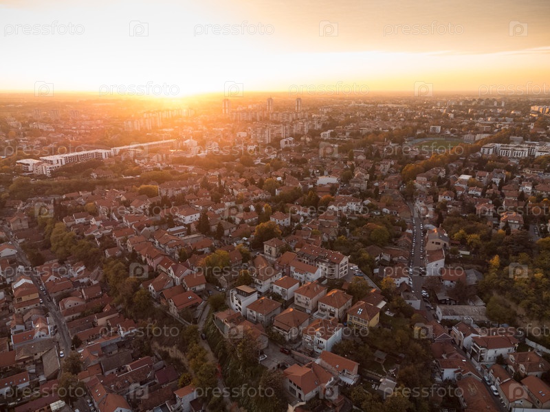 Вид с беспилотника на закат солнца над районом Земум, Белград, Сербия, Европа. 4K