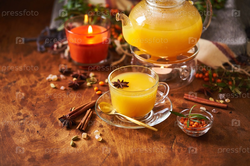 Стеклянный чайник и чашка из морского гречневого терна с палочками корицы и звездным анисом на деревянном фоне
