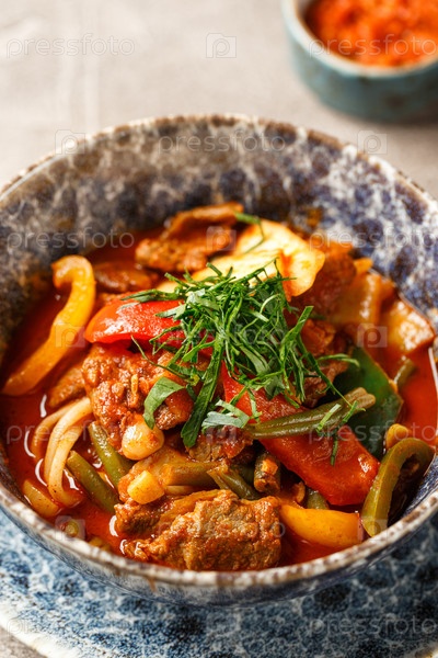 Традиционный азиатский суп шурпа с ягненком и овощами. концепция кухни Центральной Азии и Восточной Азии