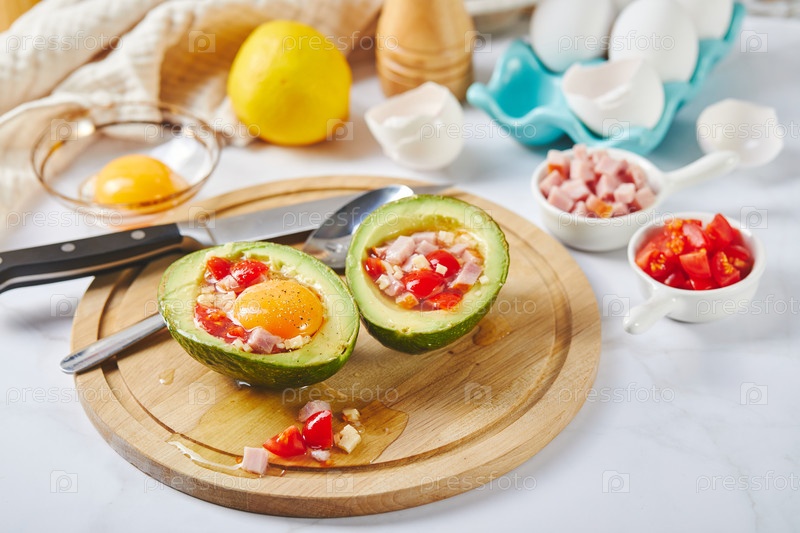 Авокадо с яйцами, ветчиной, помидорами и сыром. рецепт кето-обеденного обеда. перед выпечкой
