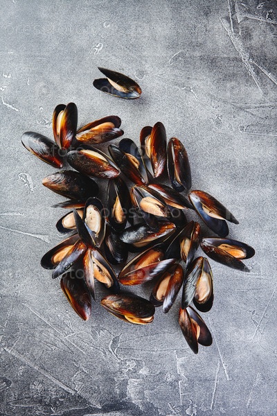 Близкий план большой группы сырых свежих мидий на сером фоне