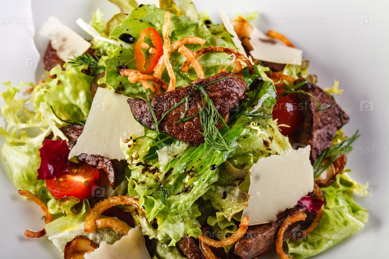 Теплый салат с жареной куриной печенью и пармезаном