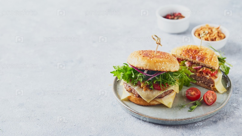 Два бургера с телячьим котлетом и травами на деревянной доске для резки