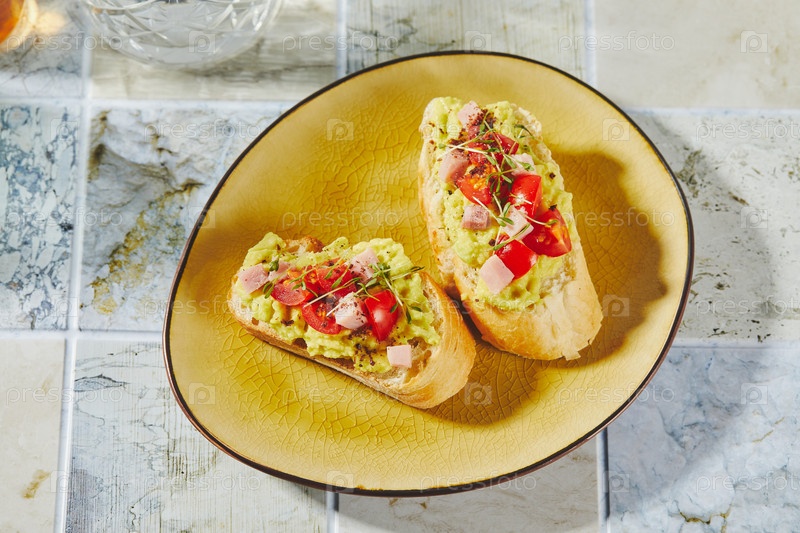Кростини или брушетта с смягченным авокадо, ветчиной и томатами. Тост с пюре авокадо