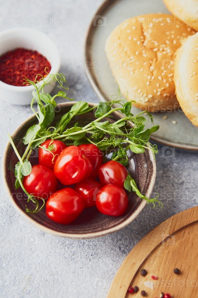 Вишневые помидоры и зеленые горошины в миске на столе