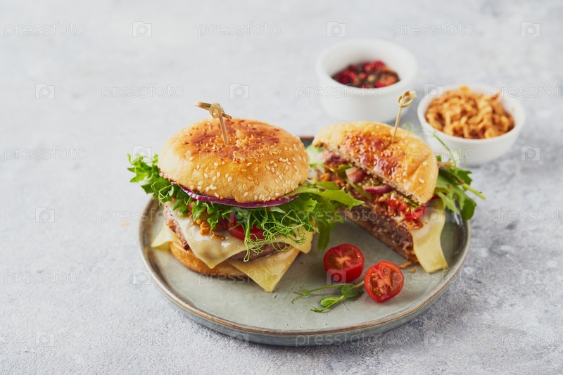 Два гамбургера с телячьим котлетом и травами на деревянной доске