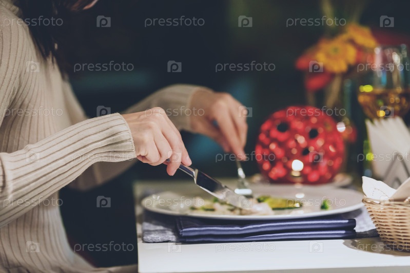 Руки женщины едят изысканное блюдо высокой кухни за столом в ресторане