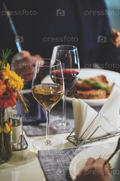 Руки мужчины едят изысканное блюдо высокой кухни за столом в ресторане