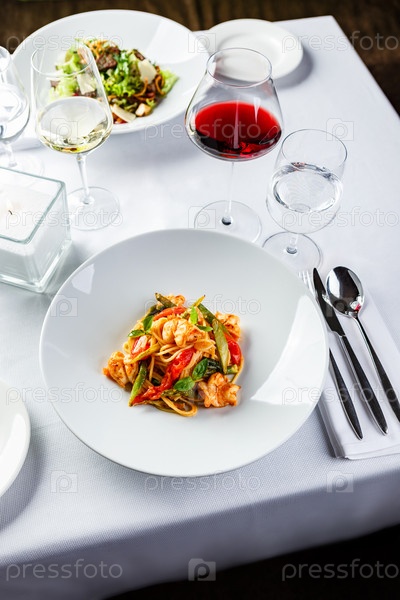 Макаронные изделия с креветками, зелеными спаржами и перцем и вином подают на стол в ресторане