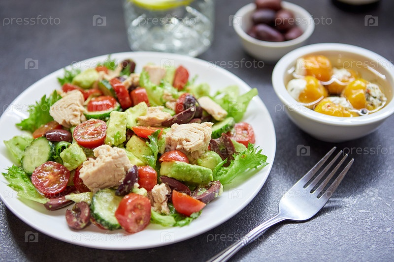 Салат с тунцом, салатами, огурцами, помидорами, маслинами и авокадо в белой тарелке на столе