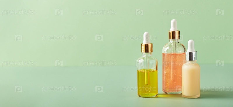 Продукты косметического ухода в стеклянных бутылках с цветами орхидей - сыворотки, кремы, гели, масла.Концепция по уходу за лицом и телом, оздоровление и спа-центр, тропический отдых