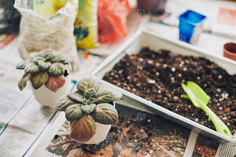 Весенняя пересадка комнатных растений, две трансплантированные святые паулии, свежая почва, гидрогель, горшки для трансплантации и мешочки с добавками в почву