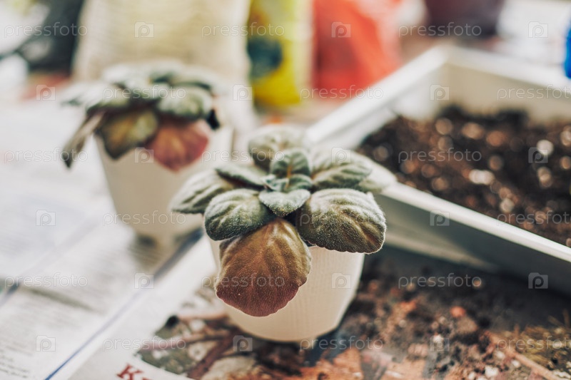 Весенняя пересадка комнатных растений, две трансплантированные святые паулии, свежая почва, гидрогель, горшки для трансплантации и мешочки с добавками в почву