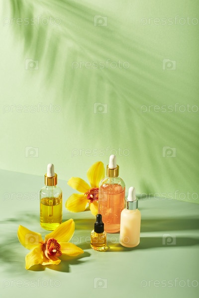 Продукты косметического ухода в стеклянных бутылках с цветами орхидей - сыворотки, кремы, гели, масла.Концепция по уходу за лицом и телом, оздоровление и спа-центр, тропический отдых