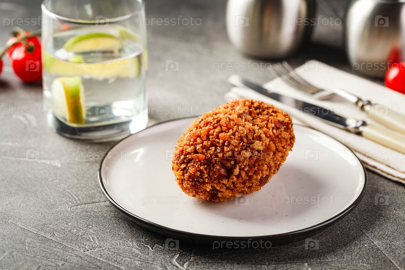 Стол обеда с тарелкой киевского котлета, меню для здорового ланча в ресторане, бизнес-ланч