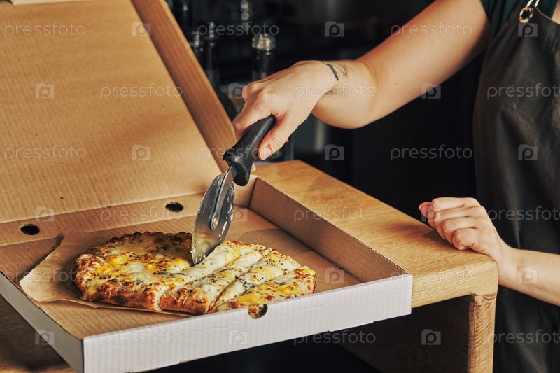 Рука женщины режет пиццу в коробке с помощью роликового ножа. римская квадратная пицца или пинса на густом тесте, итальянская кухня
