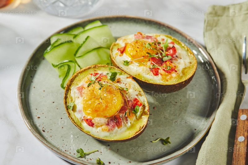 Авокадо выпечено с яйцами, ветчиной, помидорами и сыром. рецепт кето-обеденного обеда. после выпечки