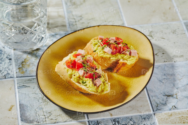 Кростини или брушетта с смягченным авокадо, ветчиной и томатами. Тост с пюре авокадо