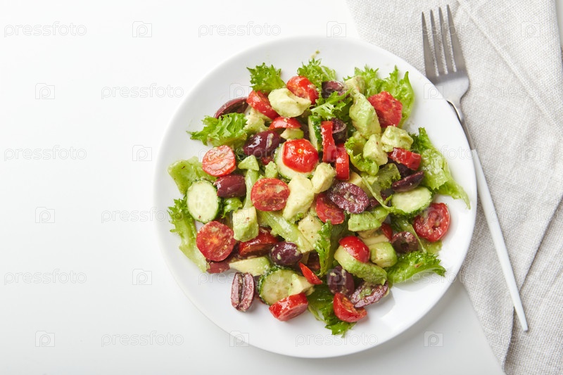 Салат с салатами, огурцами, помидорами, маслинами и авокадо в белой тарелке на столе