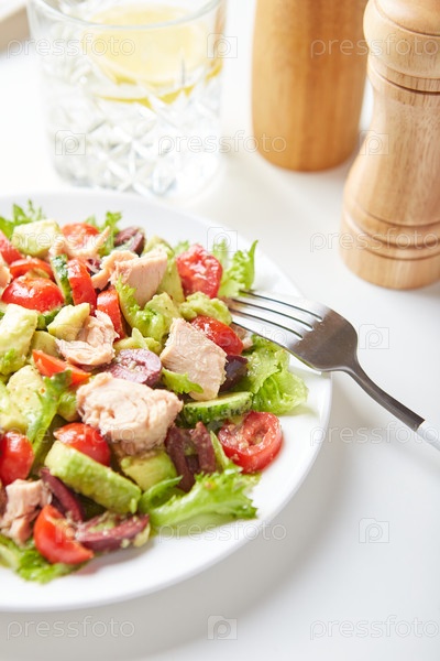 Салат с тунцом, салатами, огурцами, помидорами, маслинами и авокадо в белой тарелке на столе