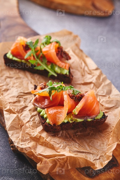 Разнообразные брюшеты с лососем. Апетитная брюшетка. Различные небольшие бутерброды или кростини. Традиционный итальянский аппетитар или закуска, антипасто